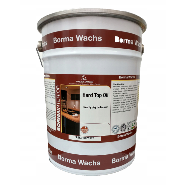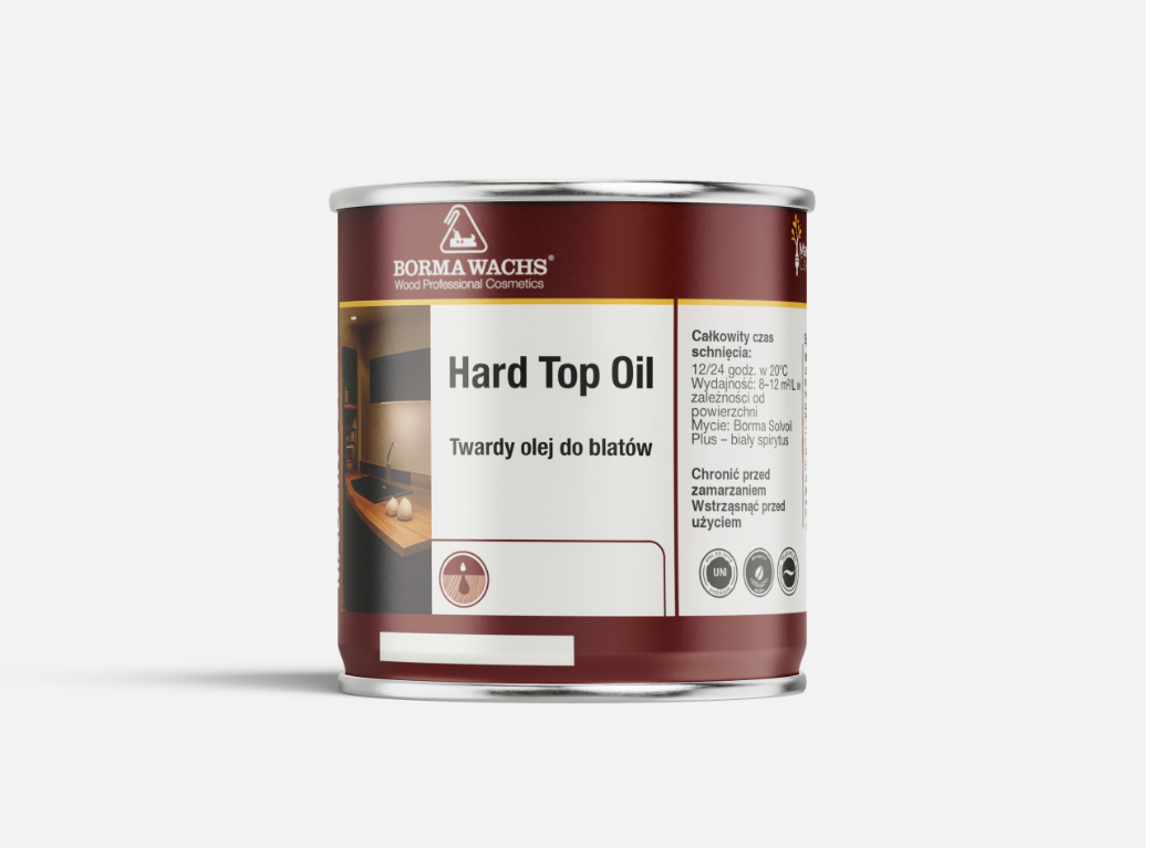 Hard Top Oil BORMA WACHS to profesjonalny, twardy olej na bazie naturalnych olejów, żywic i wosków, przeznaczony do intensywnej ochrony drewnianych blatów kuchennych, stołów i akcesoriów. Zapewnia wykończenie o ciepłym, naturalnym efekcie i aksamitnej miękkości